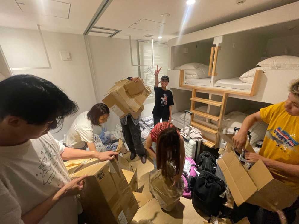 その後、宿で基地作り、なんと今回段ボール10箱分のポスター荷物を送ってもらいました!